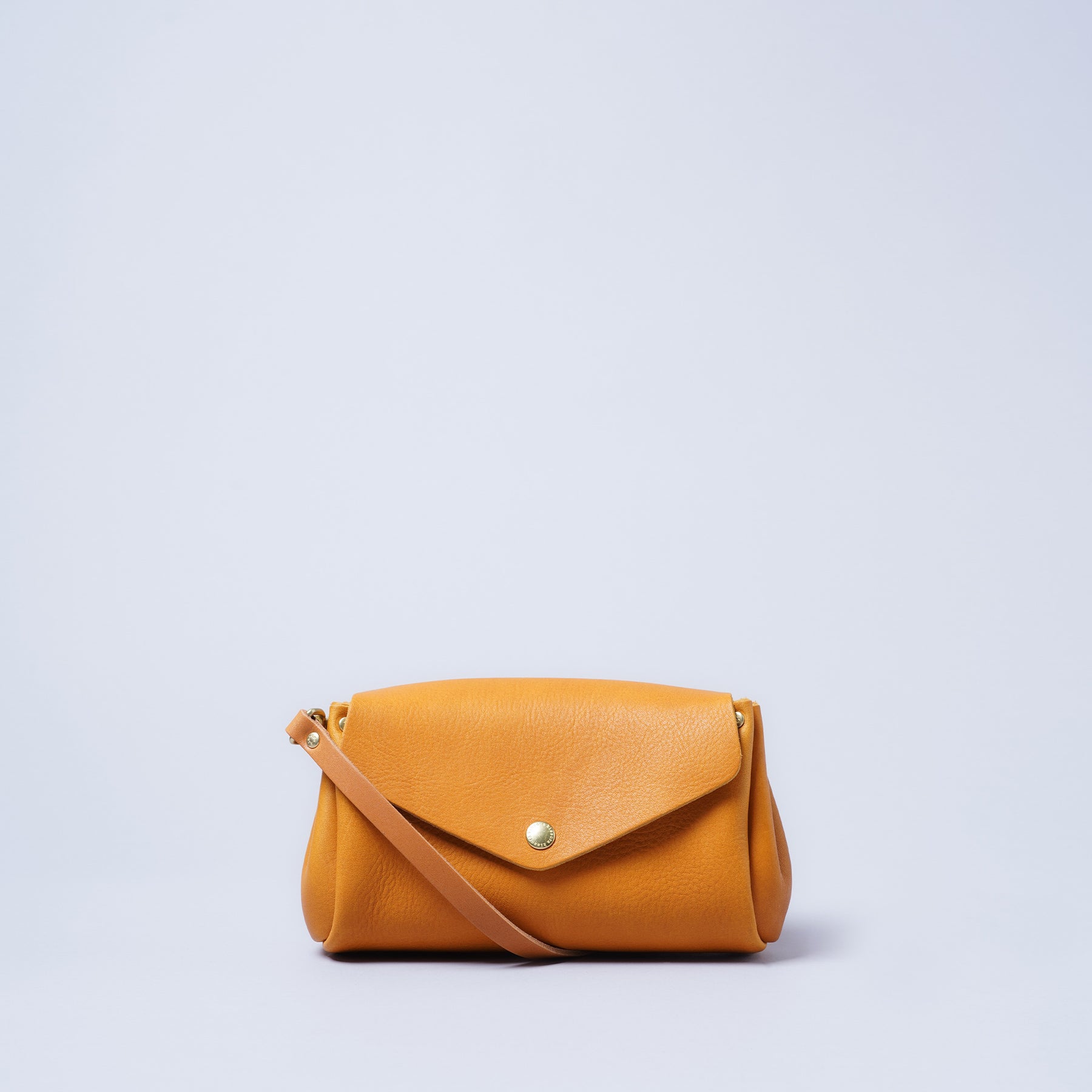 這款隨身包選用日本姫路產塗油皮革製作而成,富含油脂的皮革,擁有仿彿能貼合在手掌的絕佳觸感,隨著使用時間經過,還能享受皮革獨特的色澤舊化樂趣。包包表面呈現出的紋理特徵令人感受到皮革原始魅力,肩背帶等配件則使用厚實的NUME皮革以一枚革奢侈製成。