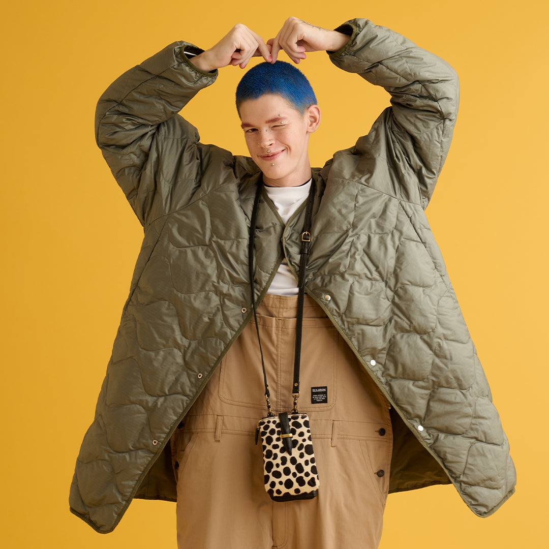 此款斜背錢包前方設有可放置智慧型手機的口袋,拉開腰帶扣環即可快速取出內部物品,方便收放。
