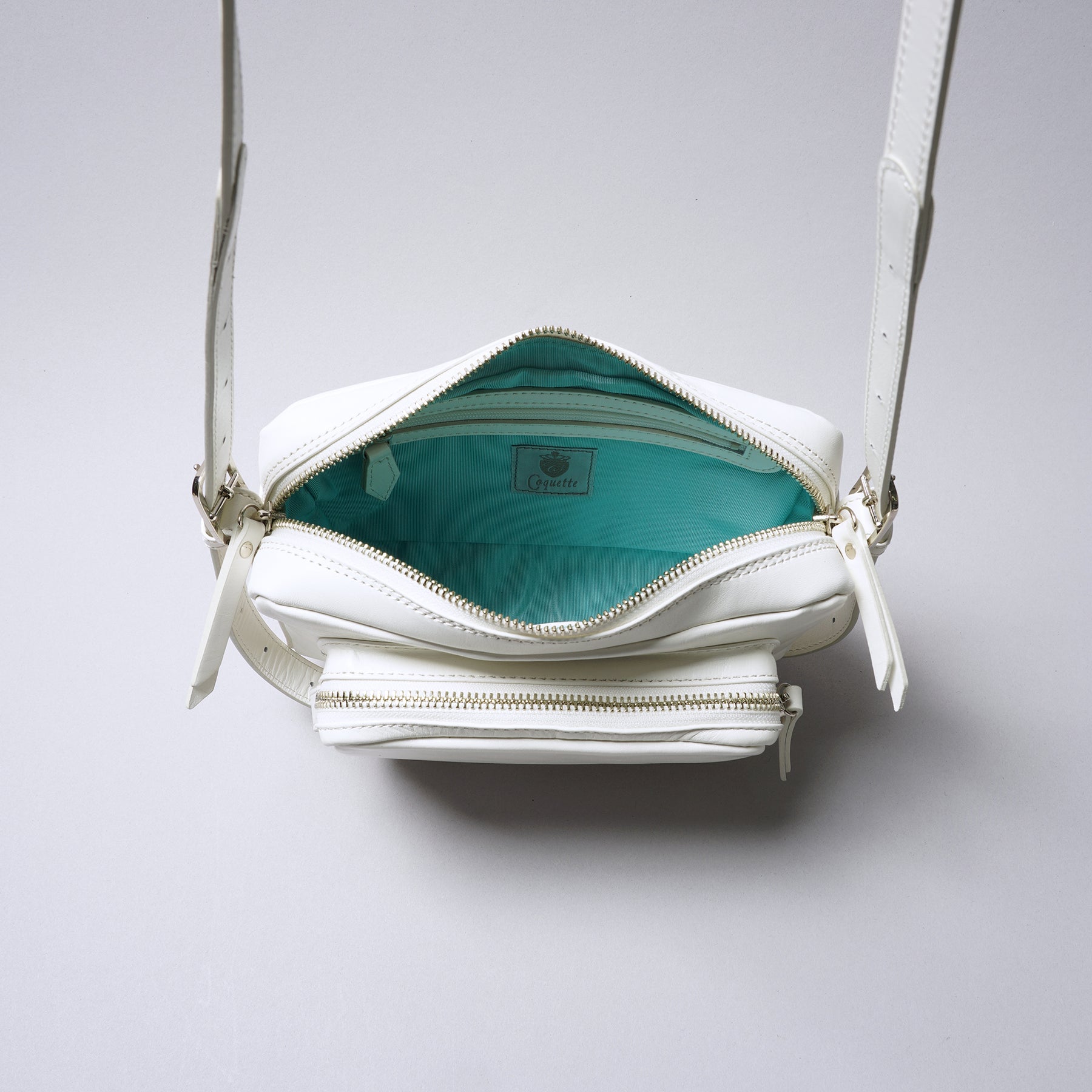 This compact shoulder bag is popular for its just-right size. The front pocket holds frequently used items like your smartphone or handkerchief. A zippered pocket is also located on the back. It's a very practical shoulder bag for travel, where you often need to retrieve items like tickets. The adjustable shoulder strap on both sides provides ample length even over winter coats. You can use it year-round. The main compartment fits a long wallet. Available in four colors: black, white, ivory, and yellow. The black version is made from full-grain tanned cowhide leather with a textured grain, while the other three colors are smooth cowhide leather. Its unisex design makes it perfect for couples or matching looks.