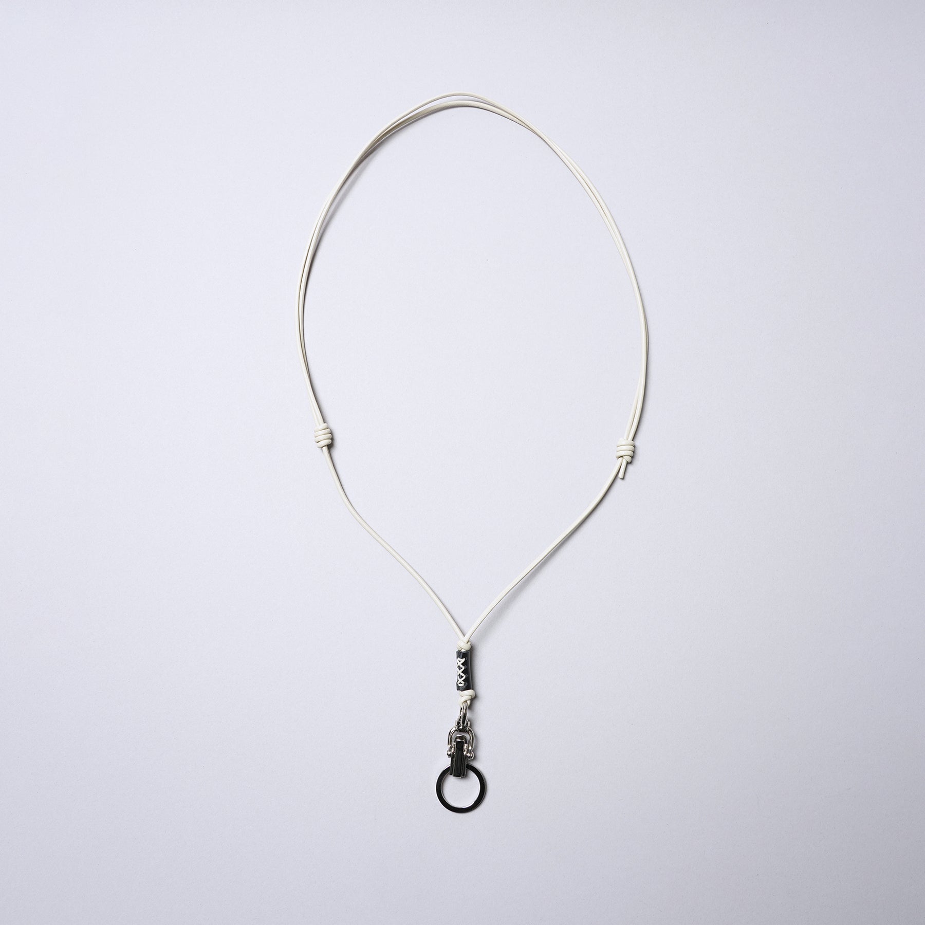 A neck strap featuring a double-ring clip-on snap hook. Use it as a glass holder or key holder with the ring attached, and remove the ring to use it as a smartphone holder or name tag holder.