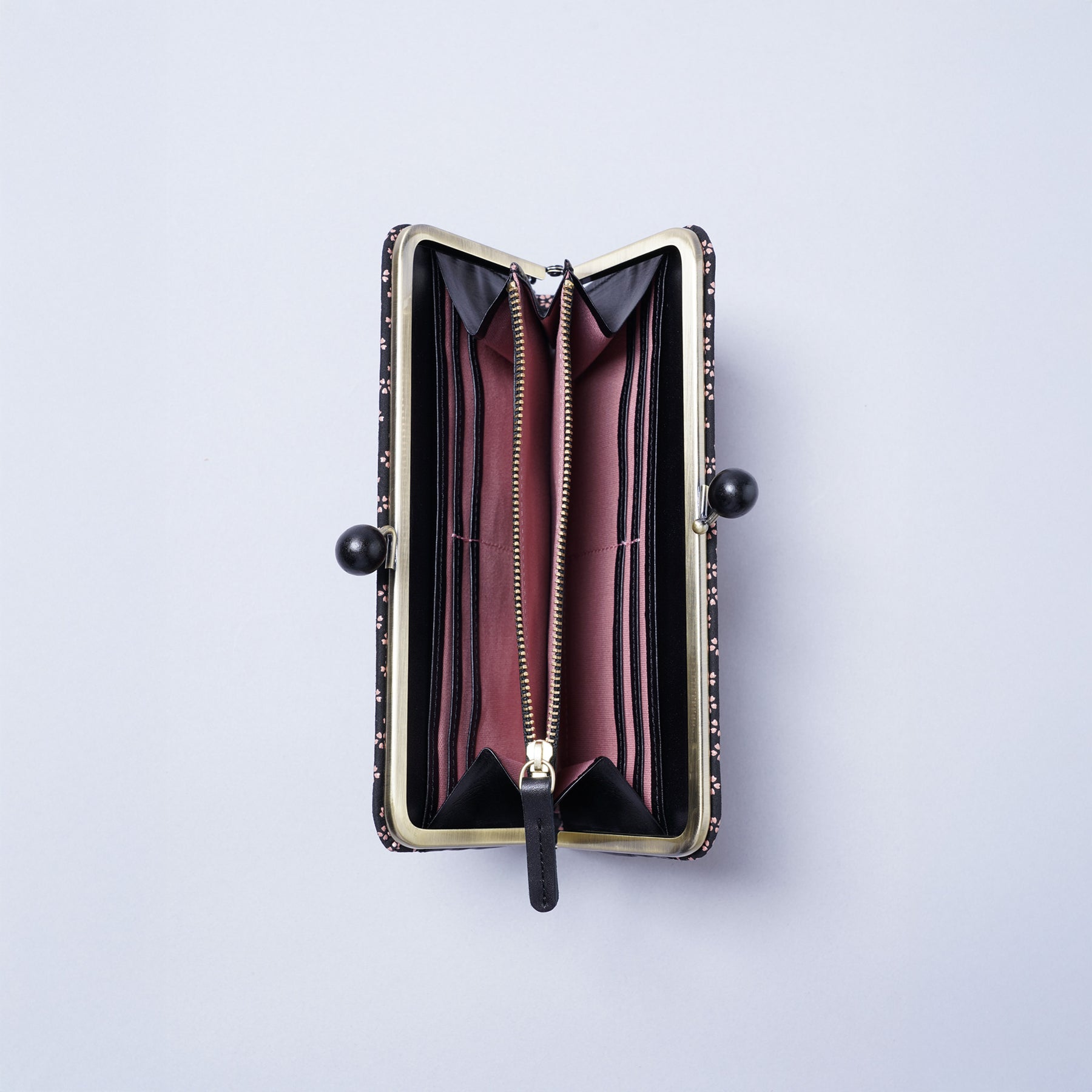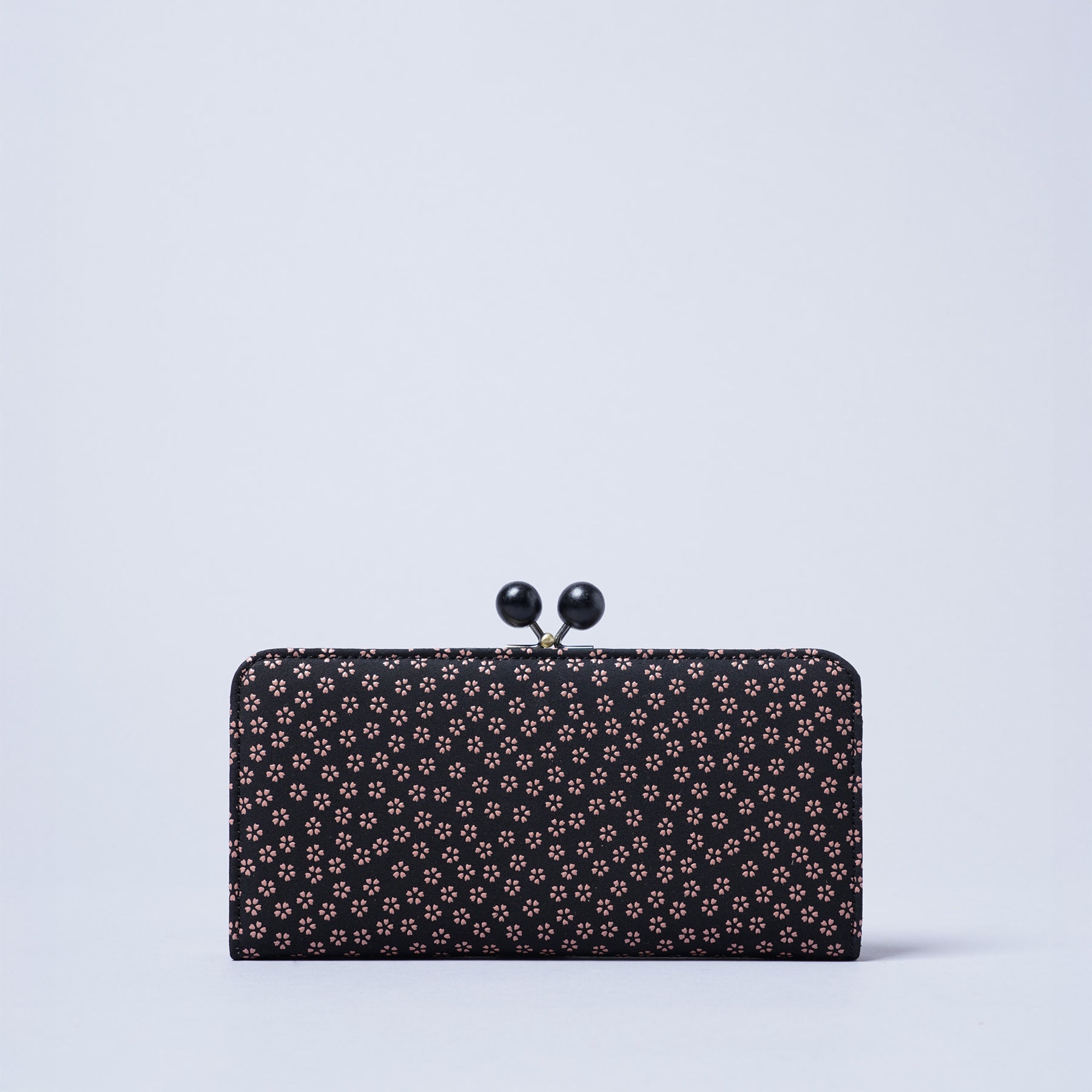 本シリーズでは木製で大きめのらっきょう玉と真鍮色の金具が上品なバランスで仕立てられたがま口を使用しています。らっきょう玉は大きいながらも軽いものを使用しているので全体の重みには影響しないのが嬉しいポイント。深い色味と木目仕様が和風をさらに演出したアクセントになっています。