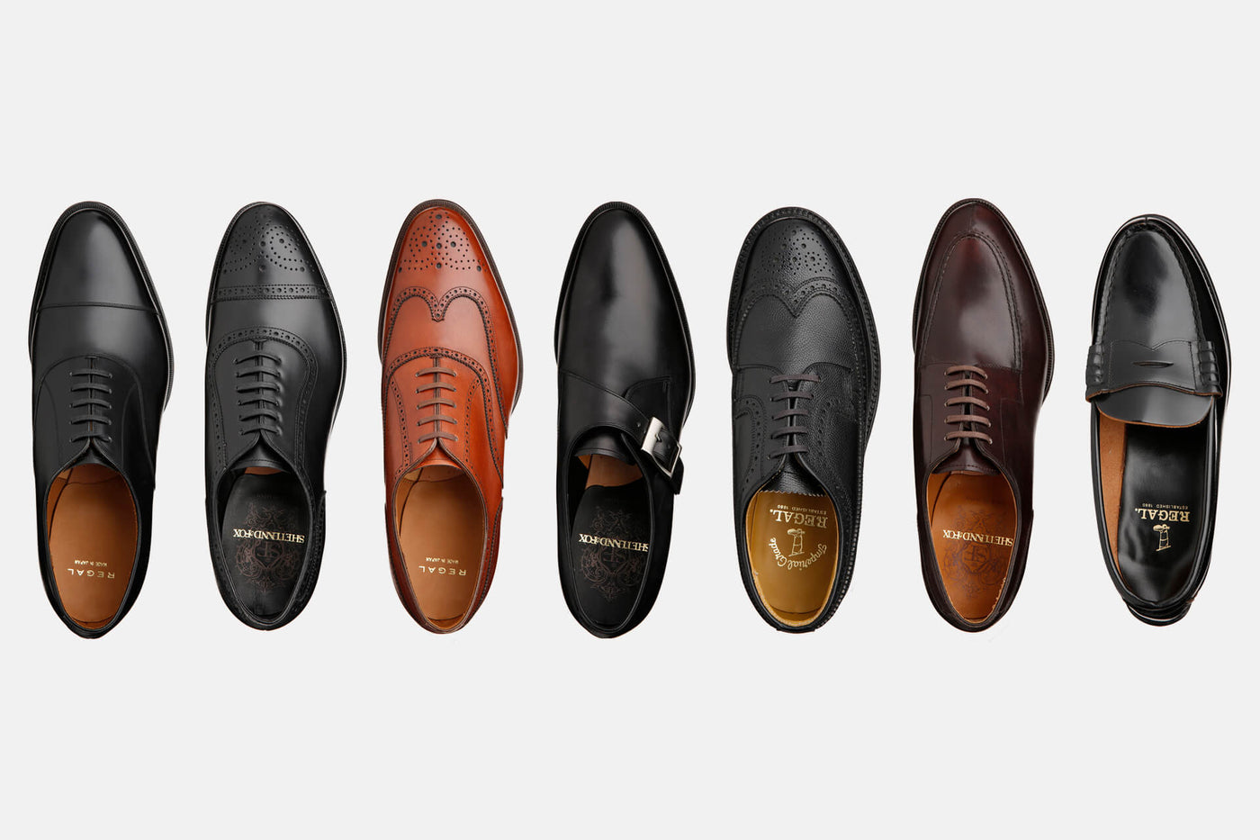 紳士靴のおもなデザインがこちら。右へ行くほど、カジュアル色が強まる。ビジネスシーンなら左3足が一般的。