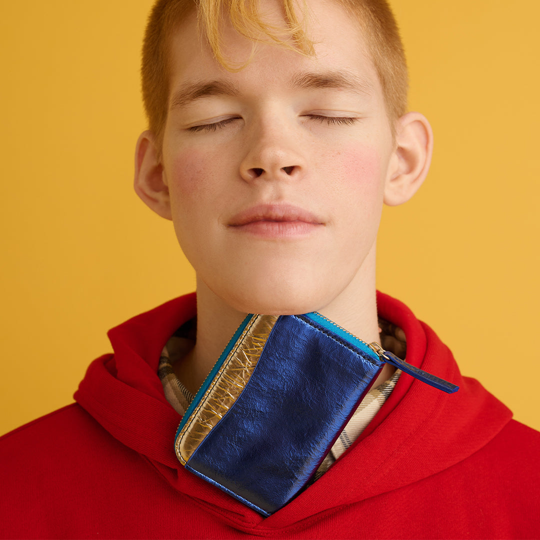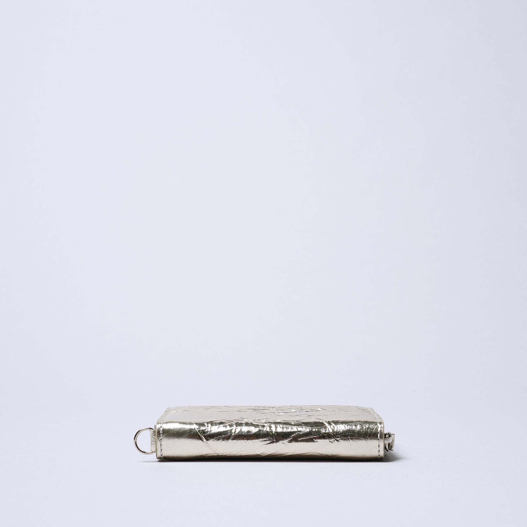 牛革に箔を貼ったイタリア製の革。箔がランダムに貼られているので傷が目立ちにくく、ユニークな表情が特徴です。